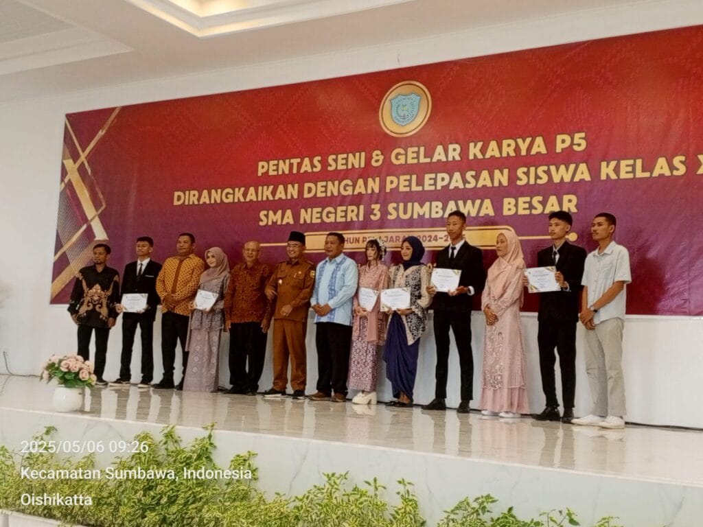 SUMBAWA BESAR, sumbawakoordinat.com – SMA Negeri 3 Sumbawa hari ini, Selasa 6 Mei 2025 menggelar Pentas Seni dan Gelar Karya P5 yang dirangkaikan dengan pelepasan siswa kelas XII. Bertempat di Auditorium Nio Garden, kegiatan ini dihadiri oleh Wakil Bupati Sumbawa, Kepala Cabang Dinas Sumbawa, Camat Sumbawa, pengawas SMA/SMK, Kepala SMAN 3 Sumbawa kepala sekolah SMKN 2, Kepala Sekolah SMAN Moyo Utara, bapak ibu guru SMAN 3 Sumbawa, komite SMAN 3 Sumbawa dan seluruh siswa sisi kelas XII beserta pendampingnya,